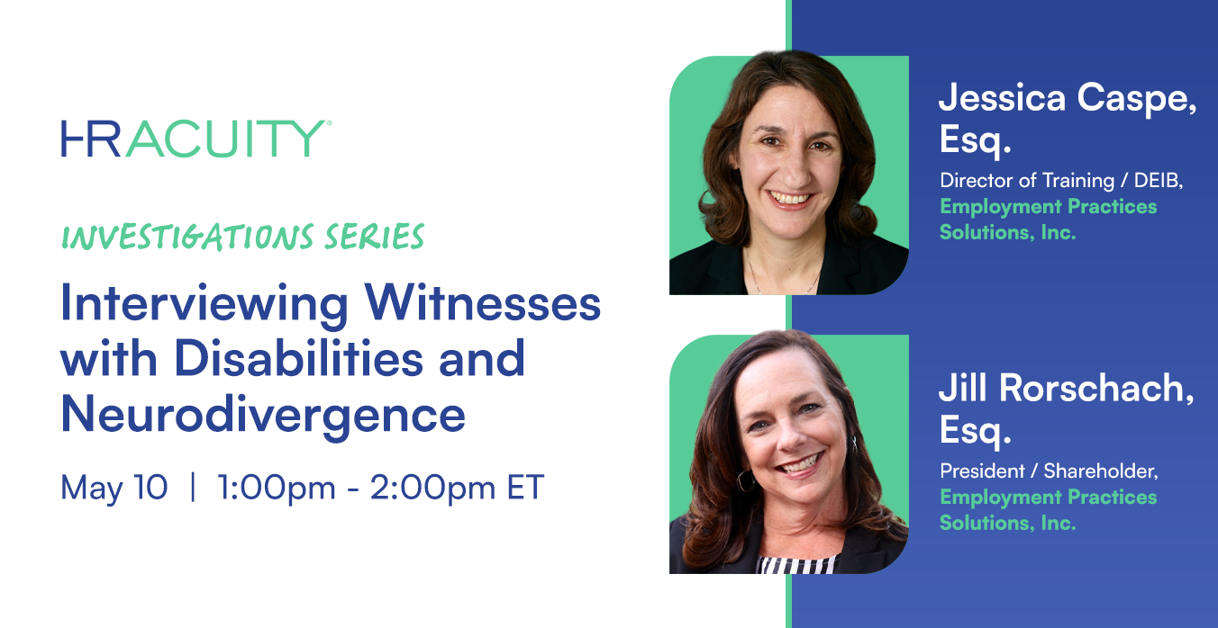 We are pleased to partner with HR Acuity once again to present the webinar "Conducting Inclusive Investigations: Interviewing Witnesses with Disabilities and Neurodivergence."